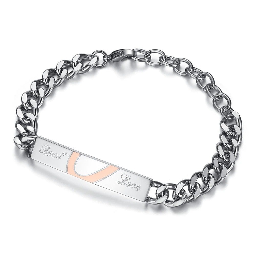 اساور كبلز عبارة عن سلسلة فضية وقطعة معدنية مرسوم عليها نصف قلب ومكتوب عليها عبارة Real Love