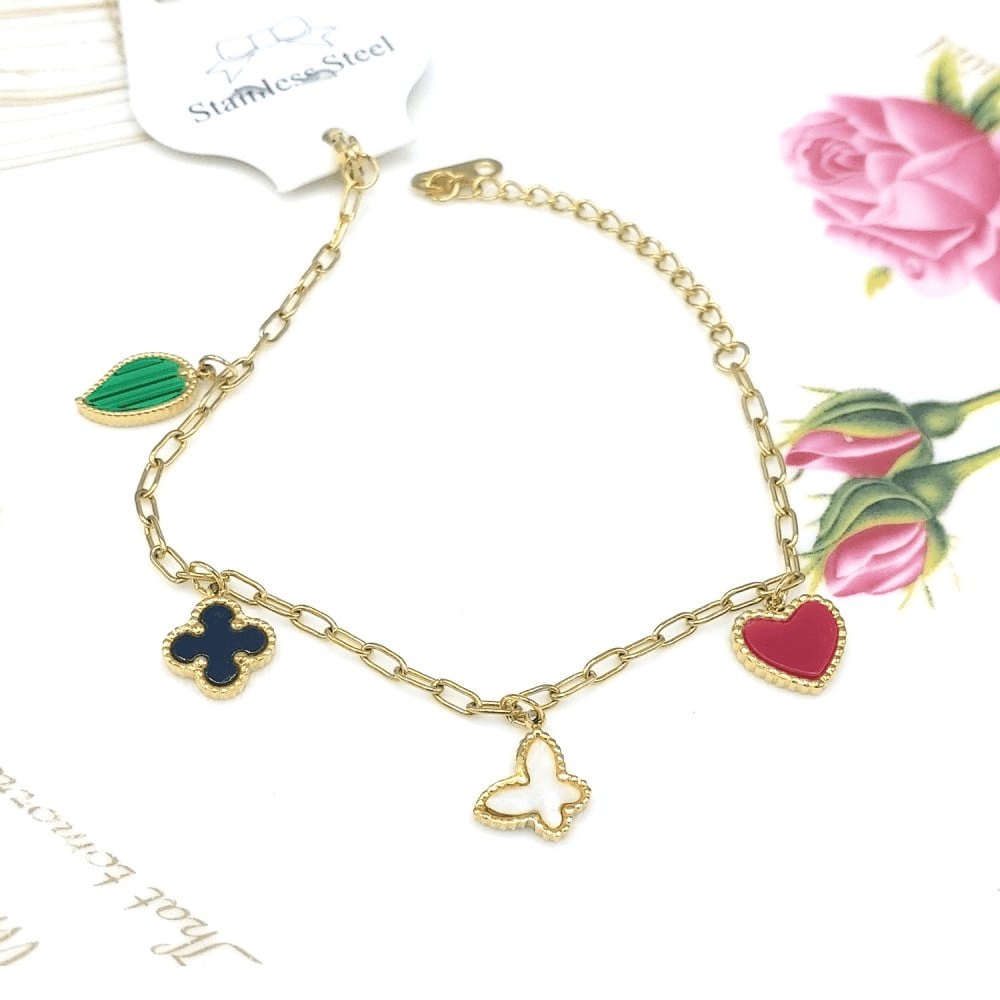 تميزي بأسلوبك مع اسوارة فان كليف المميزة والمزينة بتعليقات ملونة تضفي لمسة حيوية وأنيقة. مصنوعة بدقة ومطلية بماء الذهب عالي الجودة، لتضفي لمعانًا فاخرًا يدوم طويلاً. التعليقات تشمل فراشة بيضاء، قلبًا أحمر، ورقة خضراء، ووردة كلوفر باللون الأسود، مما يجعلها قطعة استثنائية تناسب جميع الأذواق والمناسبات.