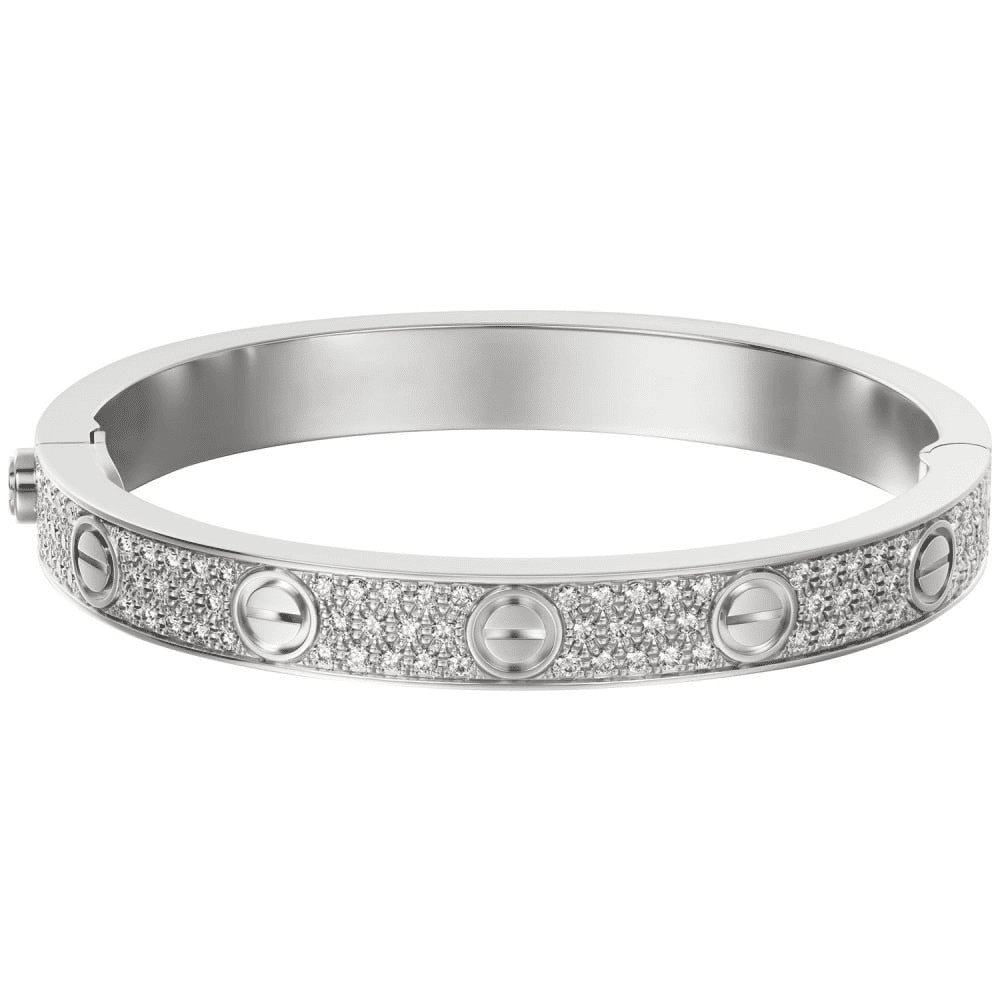 استمتعي بإطلالة أنيقة مع سوار الحب مطلي بالذهب الأبيض مرصع بأحجار الزركون، المستوحى من اللمسات الكلاسيكية لتصاميم كارتير الشهيرة. هذا السوار هو خيارك المثالي لإبراز معصمك برقي ولمعان يخطف الأنظار.