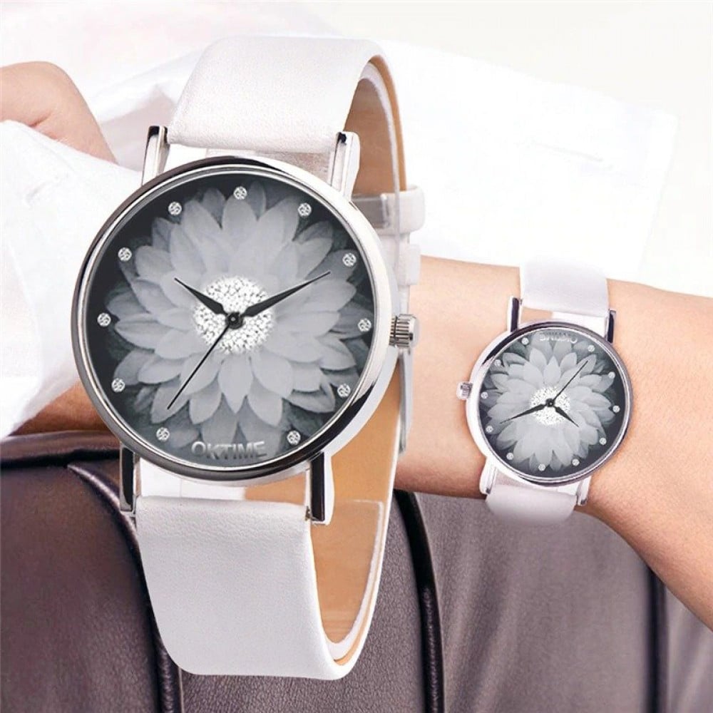 ساعة يد نسائية بناتية بخلفية وردة بيضاء شريط جلد لون أبيض