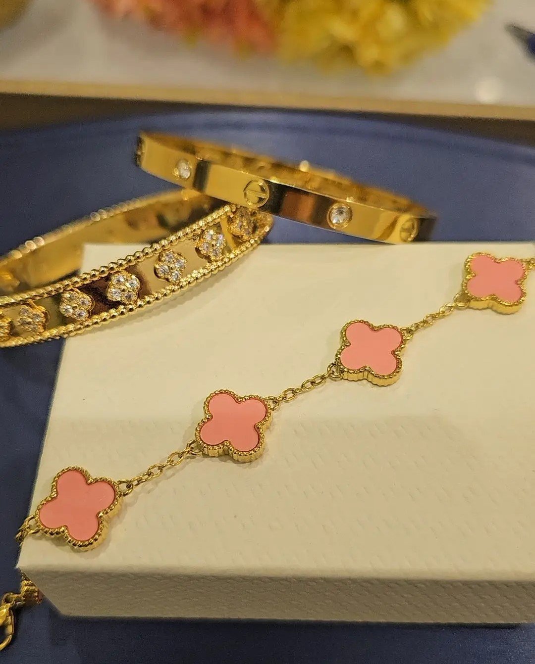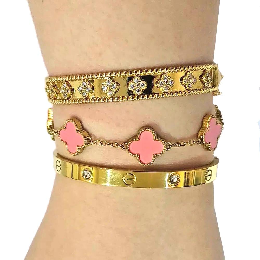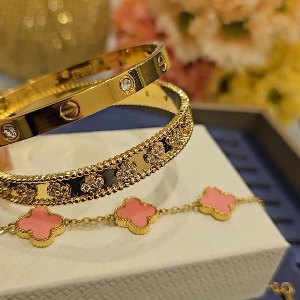 طقم اساور يتكون من ثلاث اساوراسوارة فان كليف مرصعة بوردات زركوناسوارة فان كليف وردياسوارة كارتير مزينة باحجار بدون مفك